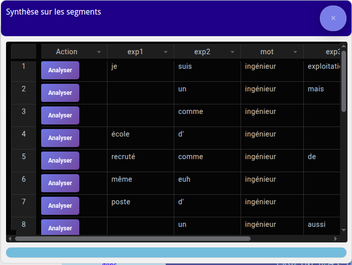 construction_tableau(zone_table, ["Action","exp1","exp2","mot","exp3","exp4","info","locuteur","sexe","tranche"],lines);