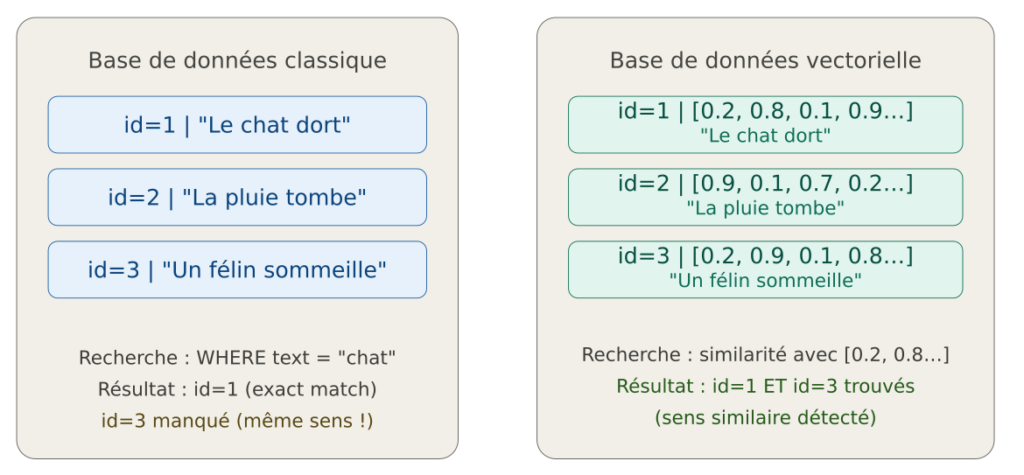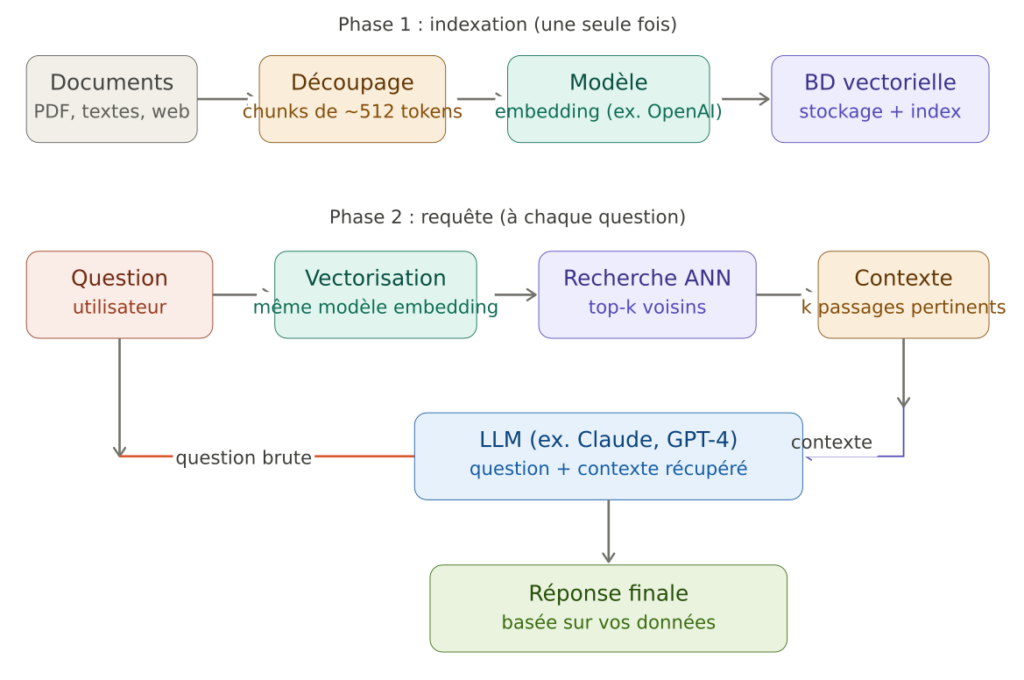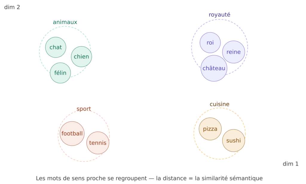 Les mots de sens proche se regroupent – la distance = la similarité sémantique. En réalisté, les embeddings ont des centaines ou milliers de dimensions (OpenAI text-embedding-3-small = 1536 dimensions).