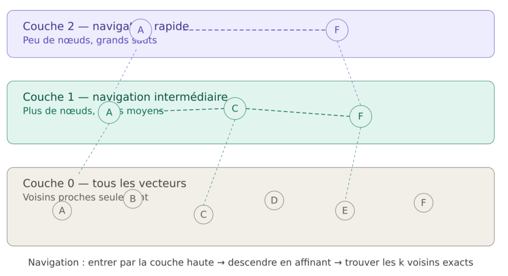 HNSW atteint des complexités sub-linéaires (~O(log(n)) contre O(n) pour la recherche brute. D’autres algorithmes existent IVF(Inverted File Index), PQ(Product Quantization, Scann, etc.