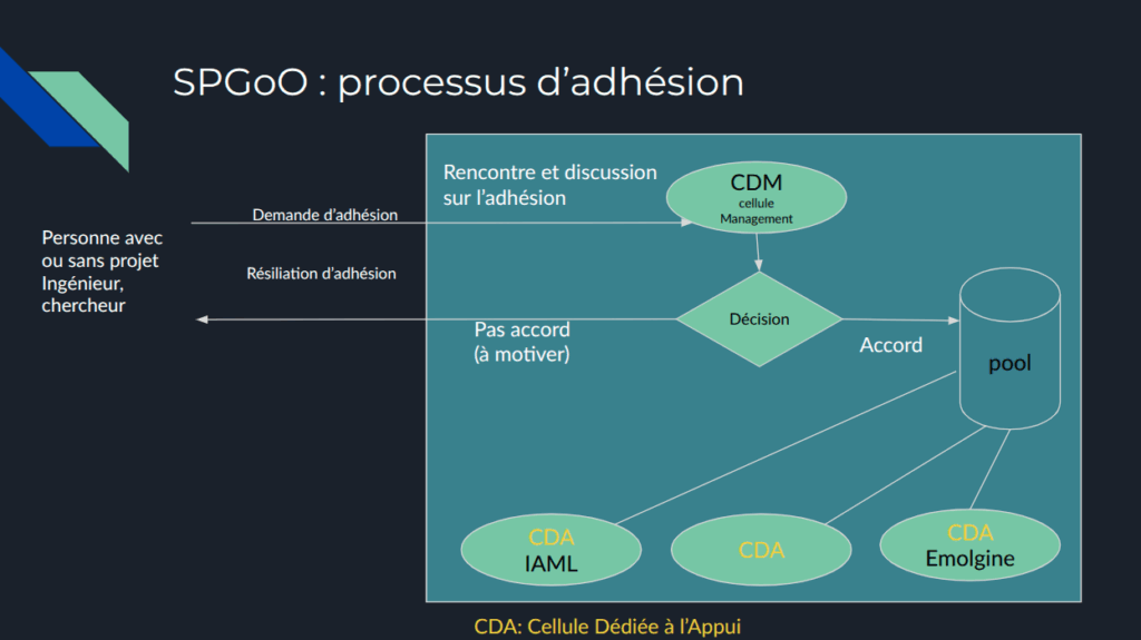SPGoO est une structure mutualisée de compétences informatiques en “data science” au service des projets de recherche. SPGoO fonctionne de manière collaborative et par adhésion. Les adhésions sont volontaires et sont soumises à l’approbation du CDM suite à un entretien. Cet entretien avec le candidat (Chercheur/Ita) a pour objectif de vérifier la nature de la demande, l’évaluation des moyens à engager et l’adéquation avec les ressources en présence. A la suite de cet entretien, plusieurs options sont possibles: